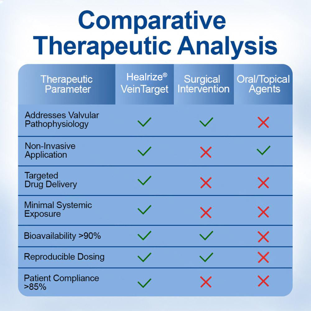 Healrize® VeinTarget represents the first commercially available transdermal phytotherapy system specifically designed to address venous valvular insufficiency through localized botanical intervention. Unlike systemic treatments that dilute active compounds throughout the circulatory system or topical applications that cannot penetrate the dermal barrier, our microneedle delivery system ensures concentrated therapeutic compounds reach the target tissue with minimal systemic exposure.